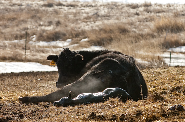 Steam rises from a newborn calf in Winifred, Montana. This calf is literally seconds old.