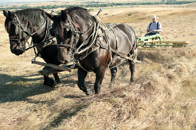 That’s Dick Huttinga and two of his Percheron draft horses, Mac and Mitch, drawing a side delivery hay rake through a field south of Bozeman recently. Dick and his brother-in-law Larry Thomas like to use draft horses and old farming equipment to do work. They let me take pictures while Dick was raking hay and while they were harvesting oats and then threshing the oats while using Al Lien’s 1940 John Deere tractor, complete with flywheel starter. “Jesus Christ, we go to a lot of work just to have fun for a couple of days,” Lien said.