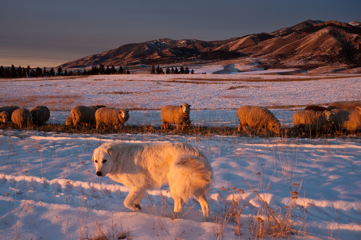 This is one of Katy and Richard Harjes’ Maremma sheepdogs, guarding the flock at their Willow Spring Ranch north of Bozeman. The Harjeses employ Maremma and akbash dogs to guard their sheep against predation. The Humane Society of the United States assigned me to make these pictures for an upcoming story they’re running in the March/April 2012 issue of All Animals, their bi-monthly membership magazine. I hear the story is about coyote predation in the U.S. and different ways of controlling it. These dogs scare predators away more often than not, teaching the coyote, wolf or bear to look elsewhere for an easy meal.