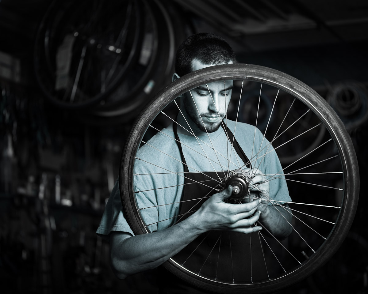 This is August Cary, who was a great model for a commercial shoot I did recently with MercuryCSC celebrating crafts people. August is a bike mechanic for Summit Bikes in Bozeman and not only took time out from his work day to pose, but was very patient with a crew of people trying to get lighting, background and composition just right while he just stood there looking at a bicycle wheel. Great job, August, and thanks.