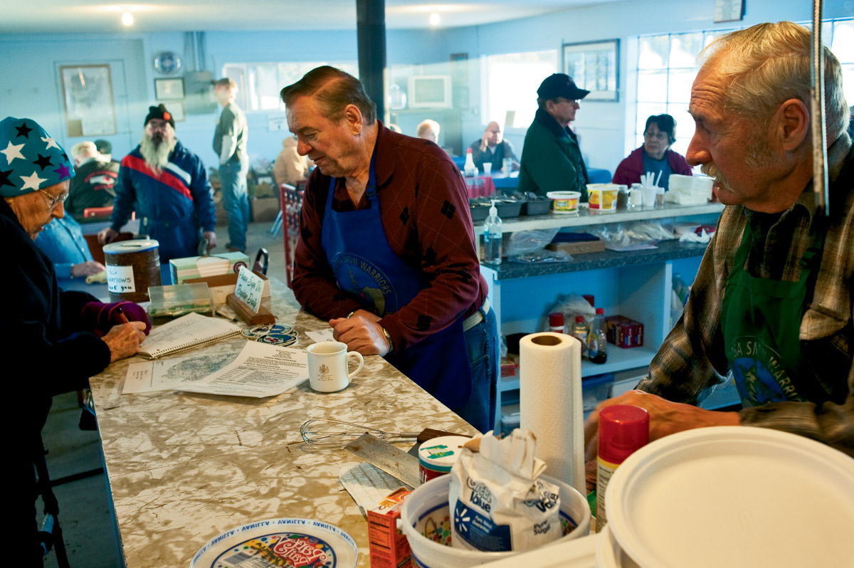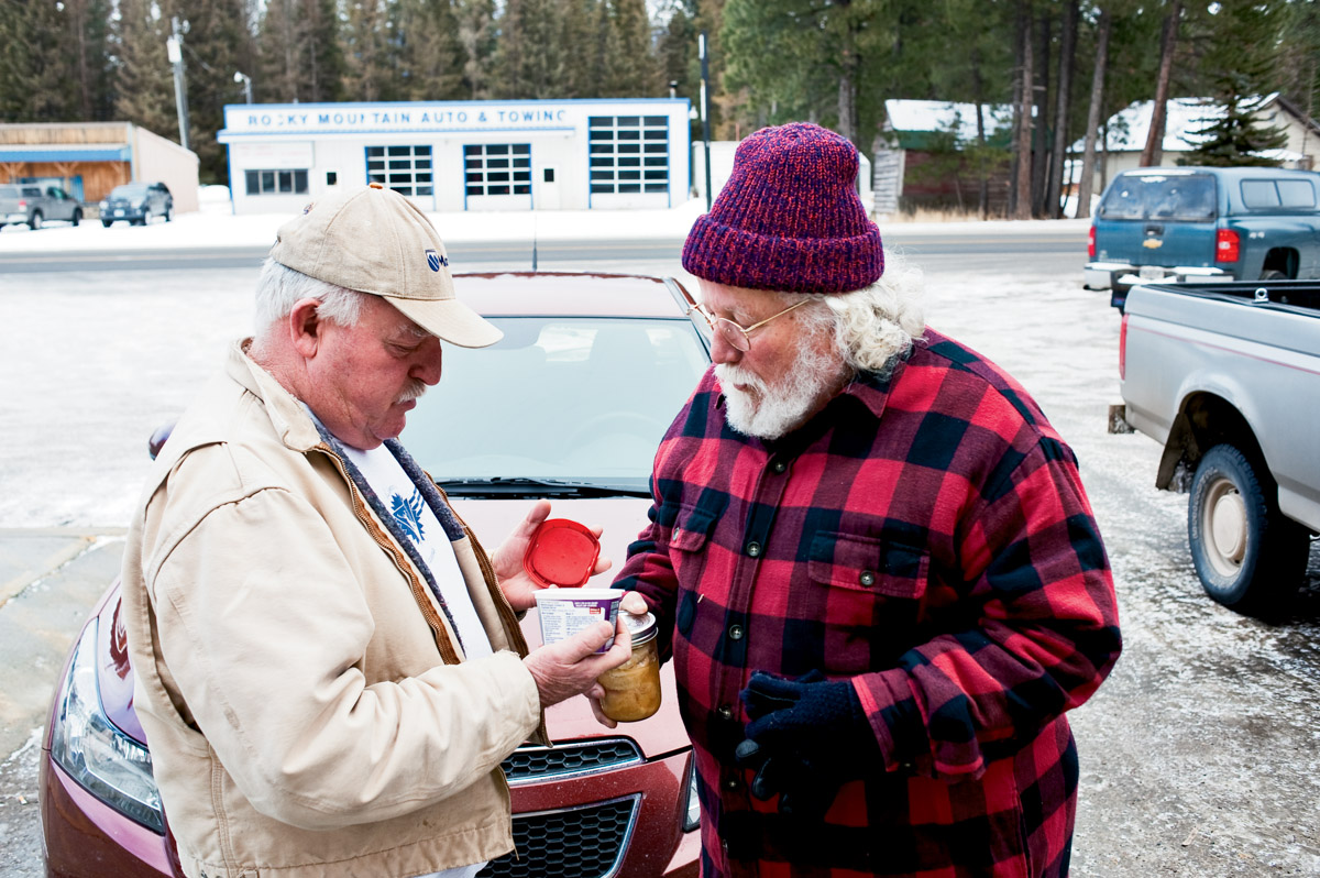 And life continues in Lincoln. It may be moving from timber town to retirement community, but maybe that’s not so bad. Denny Peterson, left, and Bob Armstrong trade bean soup for canned fish outside the Lincoln Post Office. “This is how we survive in Lincoln,” jokes Peterson. Armstrong, who says he just trimmed his beard after serving as the local Santa, has lived in Lincoln 32 years. “We like Lincoln,” he says. “It’s a nice place to live.”