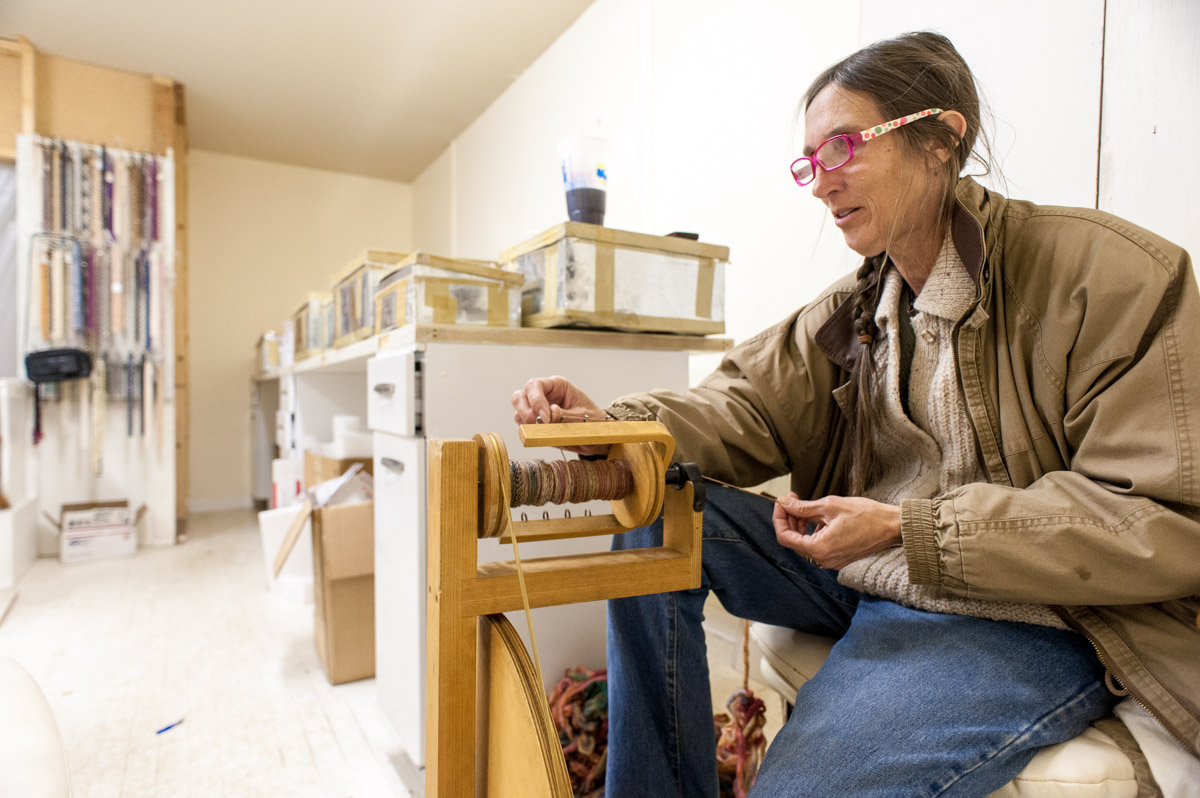 Cindi Laffin spins yarn and sells beads from one of the old buildings in St. Marie. She describes herself as a conspiracy theorist. “I walk a fine line between nut case and ‘you really should listen to me,'” she says. She says she wants to build a self-sufficient community and that she raises 6,000 to 7,000 pounds of produce every year in a garden behind the building.