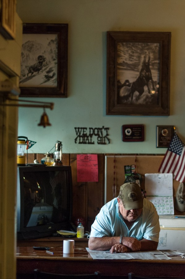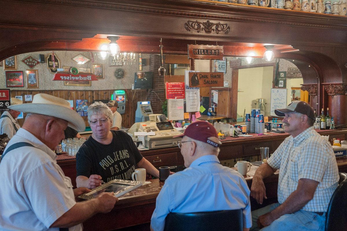 Many of the present settlers of the HPID stop in at one time or another to drink coffee or beer at the Dark Horse Saloon in downtown Worden. Dick Miller, reading the paper just before the second shift of coffee drinkers steps in, owns the Dark Horse with his wife, Dixie.