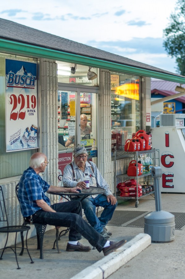 The Express Way convenience store is a big gathering spot in downtown Huntley, population 446. Jim Clarkson, left, visits with Bud Sherrodd, a farmer and construction contractor who who says he spent a portion of that day digging a hole for a friend’s new septic system in Huntley.