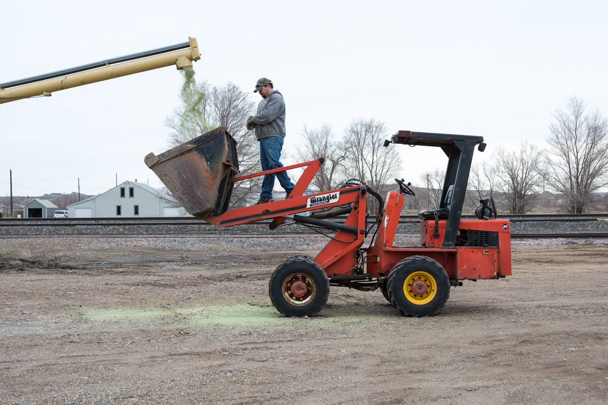 Agriculture is still the driving force in Terry. “The two largest roots to the irrigated production we have on the Yellowstone River are the water itself, and fertilizer,” says Farmer’s Union Oil Company Manager Larry Keitner while Junior Fischer moves fertilizer pellets with a small tractor from bin to elevator to truck. Local farmers grow grains, hay and beans, Keitner says, using water from the Yellowstone to increase productivity and using chemicals to replenish nutrients in the soil.