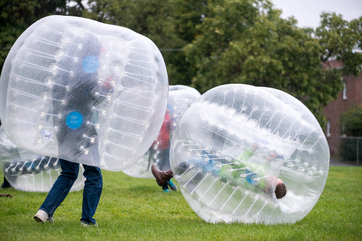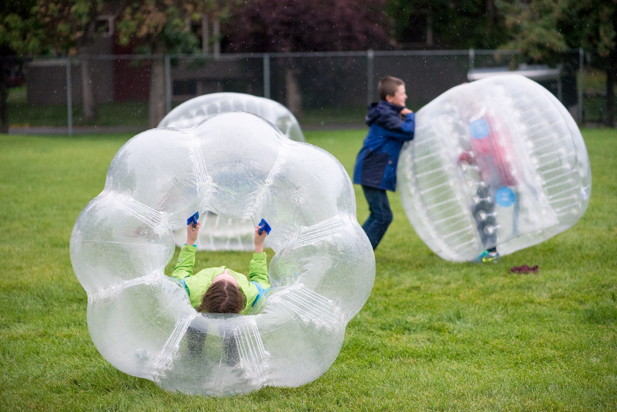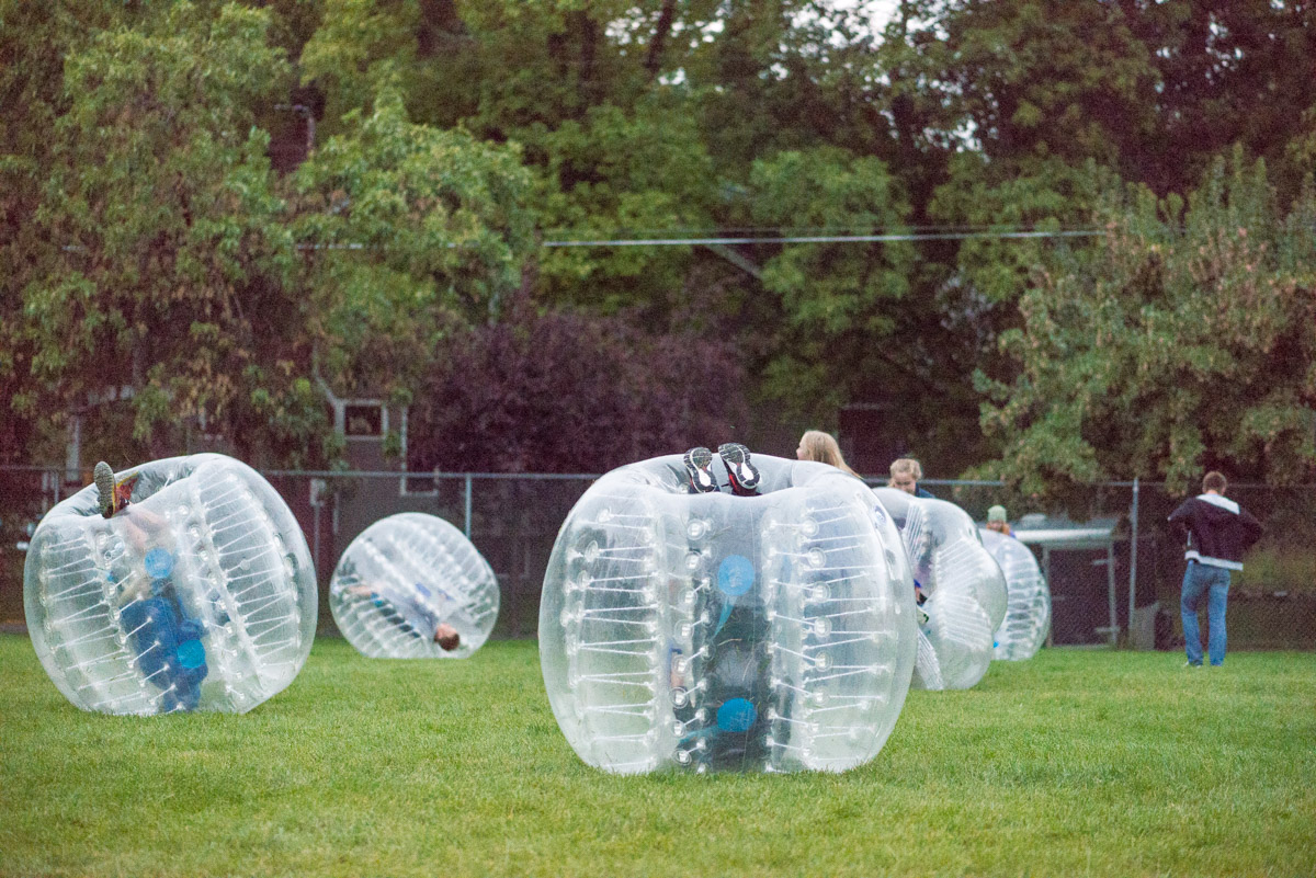 It’s called Bubble Ball and started in Europe a few years ago. Here’s a video of people trying to play soccer wearing the things. The other night near the Emerson Cultural Center here in Bozeman, there was a soccer ball on the field, but it went largely ignored in favor of the fun of sending a friend flying.