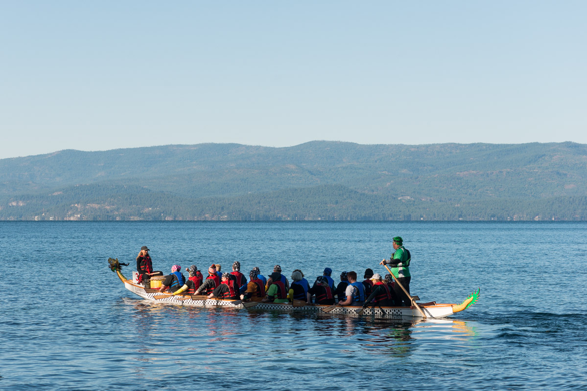 Imagine this: You’re in a 46-foot canoe with 19 other weekend warriors paddling across Flathead Lake and there’s a crazy person in the bow beating on a drum and yelling at you to STROKE!