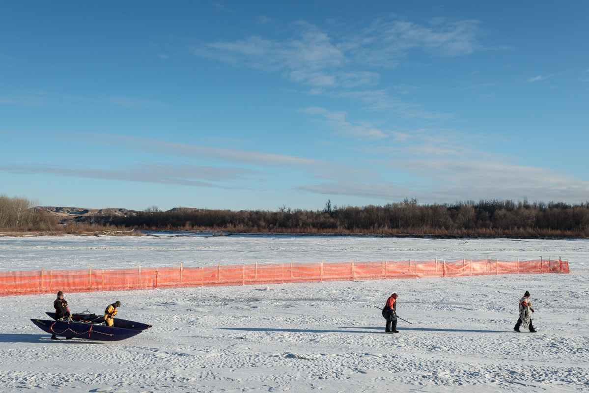 Perhaps 60 miles downstream of the spill, near Crane, Mont., workers setting up some kind of spill containment on the Yellowstone, having to cut through the ice to get at the water. Closer to Glendive, at the Intake dam, game wardens from Montana Fish, Wildlife and Parks told me they could smell oil coming from the river for the first time after the spill, but had not noticed any visible evidence of contamination.